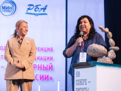 Министр культуры Мурманской области Ольга Обухова вручила символ «Библиотечной столицы России» — скульптурную композицию из северных камней — министру культуры Республики Татарстан Ираде Аюповой.