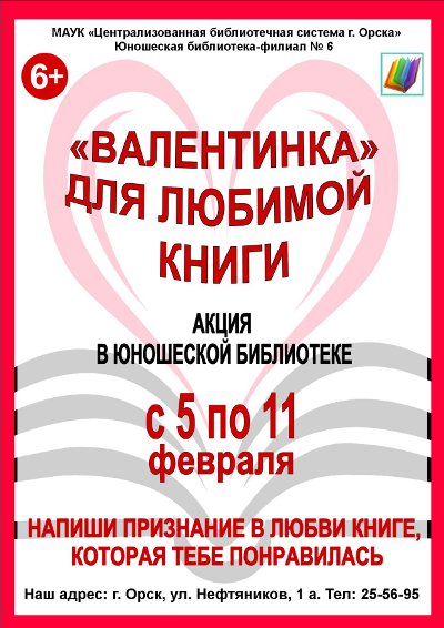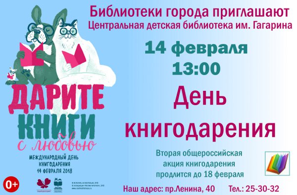 Стартует она 12 февраля и продлится неделюС 12 по 18 февраля Ассоциация деятелей культуры, искусства и просвещения по приобщению детей к чтению «Растим читателя» проведет Вторую общероссийскую акцию «Дарите книги с любовью», приуроченную к Международному дню книгодарения, который с 2012 года отмечается 14 февраля в более чем 30 странах мира.