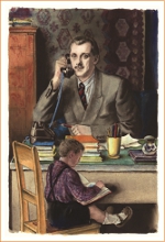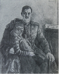 | Черно-белая репродукция картины, на которой изображены С. Михалков с сыном, опубликована в авторском сборнике стихов «Для больших и маленьких», изданном Гослитиздатом в 1944 году |