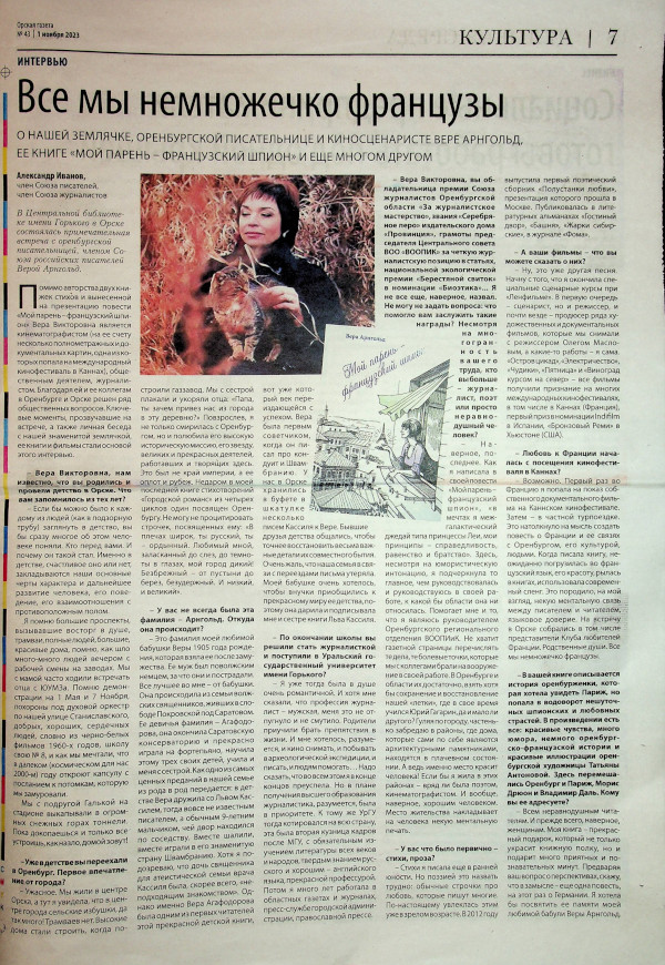 Арнгольд, В. Все мы немножечко французы : [интервью с оренбургской писательницей В. Арнгольд на встрече в Центральной библиотеке им. Горького / Вера Арнгольд ; записал Александр Иванов]. – Текст : непосредственный /