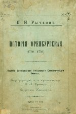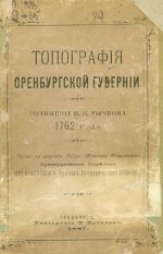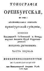 | Следуя советам В.Н. Татищева, Рычков решает в дополнение к ландкартам написать текст «Топографии Оренбургской губернии». К началу 1755 г. была готова первая часть «Топографии Оренбургской», автор высылает ее рукопись М.В. Ломоносову. Он дал высокую оценку труду Рычкова и добивался того, чтобы «Топография» была как можно скорее опубликована. К апрелю 1760 г. Рычков заканчивает вторую часть «Топографии Оренбургской», а в начале 1762 г. печатаются первые главы капитального труда Рычкова. Основными источниками для составления и написания «Топографии» служили личные наблюдения Рычкова во время его поездок по Оренбургскому краю, опросные сведения, собранные во время бесед с местными жителями разных национальностей, официальная информация представителей различных миссий, посольств, побывавших в Казахстане и Средней Азии, опросные сведения, полученные в беседах со среднеазиатскими купцами, письменные и устные сообщения и отчеты чиновников и других работников оренбургской администрации, официальные документы, хранившиеся в Оренбургской губернской канцелярии, печатные и рукописные источники, переводы азиатских книг, картографические материалы. | ![]() |